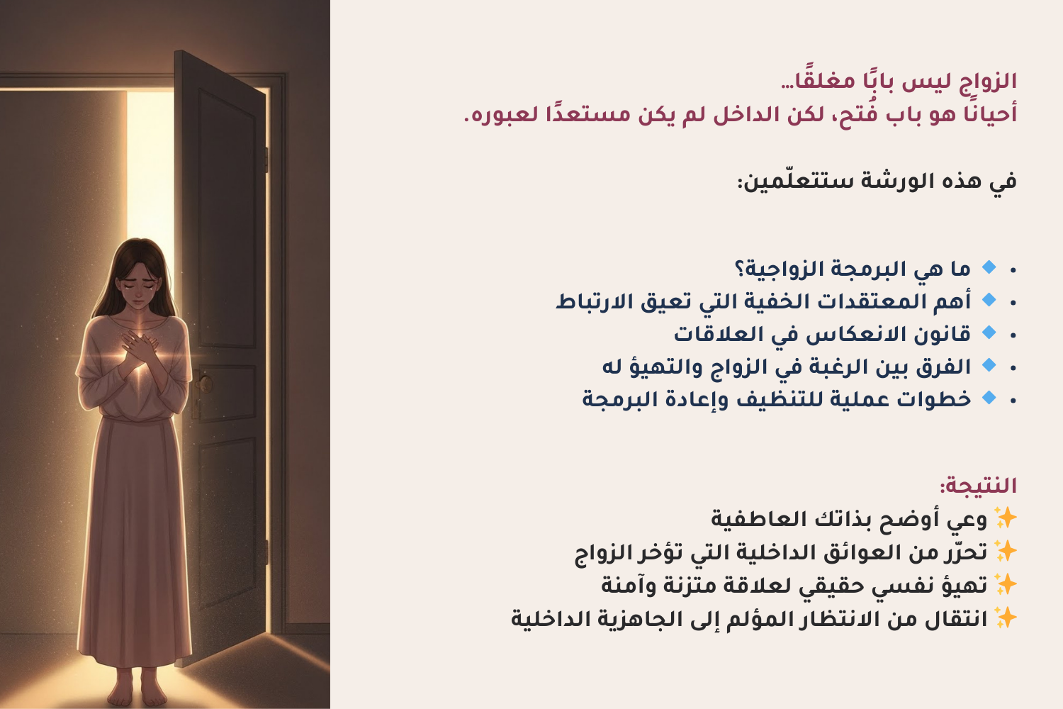 في هذه الورشة ستكتشفين لماذا يتأخر الزواج لديكِ من الداخل، وتبدئين بتفكيك البرمجة العاطفية التي تعيق الارتباط، لتتهيئي نفسيًا وعاطفيًا لعلاقة صحية قائمة على الأمان والاستحقاق، بدل التكرار، الخوف، أو الانتظار المؤلم.
